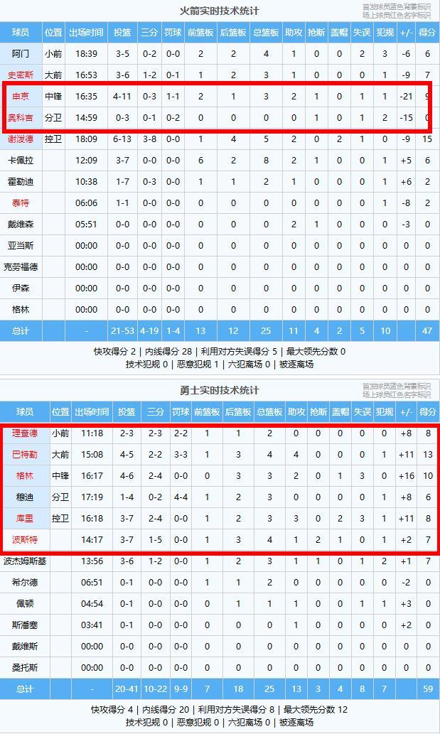 谢泼德15分5板2助2帽、申京9分3板2助、史密斯7分3板1助、卡佩拉6分8板2助、阿门6分4板1助、霍勒迪2分2板1助、泰特2分、戴维森2助