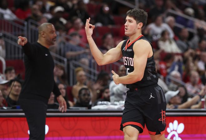 新赛季NBA常规赛开打一个多月,有三支球队的百回合净效率值在+10以上,放在过去任何赛季,这都是当赛季最大夺冠热门,但本赛季竞争确实激烈,而且还都在西部。他们分别是雷霆(百回合净效率值+16.2)、火箭(净效率值+10.9)以及掘金(净效率值+10.0)。雷霆上赛季夺冠后,年轻人自信心提升,亚历山大保底,他们有很大概率寻求卫冕;掘金则依靠约基奇强大的统治力拔高下限,约基奇本赛季PER值36.7也已经刷新历史纪录。而火箭比较有趣,开赛以来饱受伤病困扰,范乔丹重伤,芬尼史密斯打不了,甚至杜兰特都因家事连续缺席。