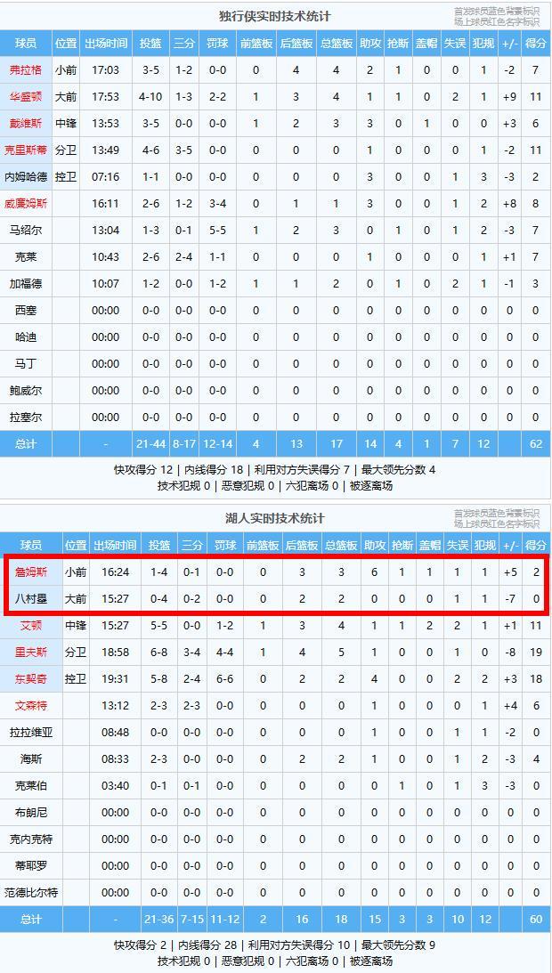头号罪人(八村塁):上半场打了15分27秒,投篮4中0,正负值-7!第二节后半段直接被弃用,他的投篮都是大空位,但他一球都投不中,状态太差了,是湖人落后头号罪人!